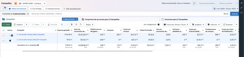 Gracias a la estrategia implementada, Zafiro Shop ha logrado importantes mejoras en su desempeño publicitario y sus resultados de negocio. Zafiro Shop alcanzó un ROAS x4,90 y un valor de conversión de compras de 10.698,96€ tal y como se puede apreciar en la captura extraída de Business Manager de Zafiro Shop.